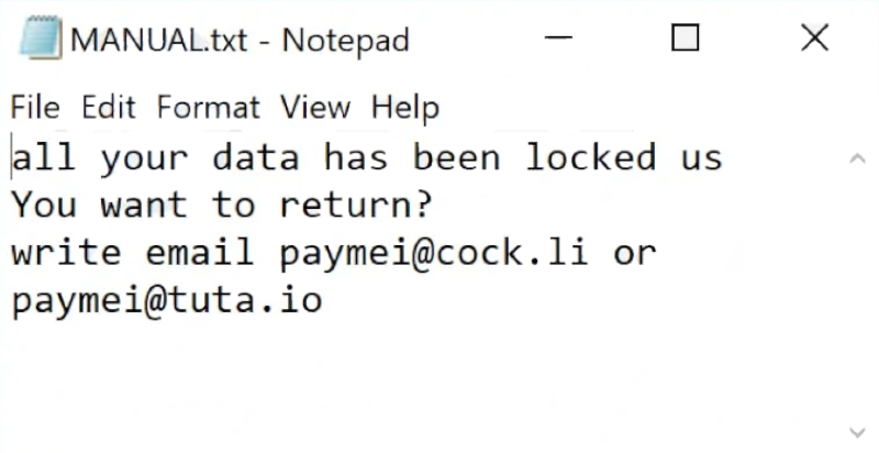 LOTUS Ransomware is a type of malware that encrypts files on a victim’s computer, rendering them inaccessible until a ransom is paid. It belongs to the Dharma ransomware family and is designed to extort money from victims by holding their data hostage. After installation, it displays a ransom message in a pop-up window and creates a text file named MANUAL.txt containing further instructions. LOTUS Ransomware appends the .LOTUS extension to the names of encrypted files. Additionally, it includes the victim’s ID and the attacker’s email address in the filename. For example, a file named 1.jpg would be renamed to 1.jpg.id-B4M9F983.[paymei@cock.li].LOTUS. After encrypting files, LOTUS ransomware creates a ransom note named “MANUAL.txt” and places it in each folder containing encrypted files. The note typically includes a notification of file encryption, instructions on how to pay the ransom (often in cryptocurrency like Bitcoin), and contact information for the attackers (e.g., paymei@cock.li, paymei@tuta.io). It also warns victims not to rename files or try to decrypt them with third-party software, as this may cause permanent damage to the files. The ransom note emphasizes that victims can only receive a decryption key or software from the attackers.