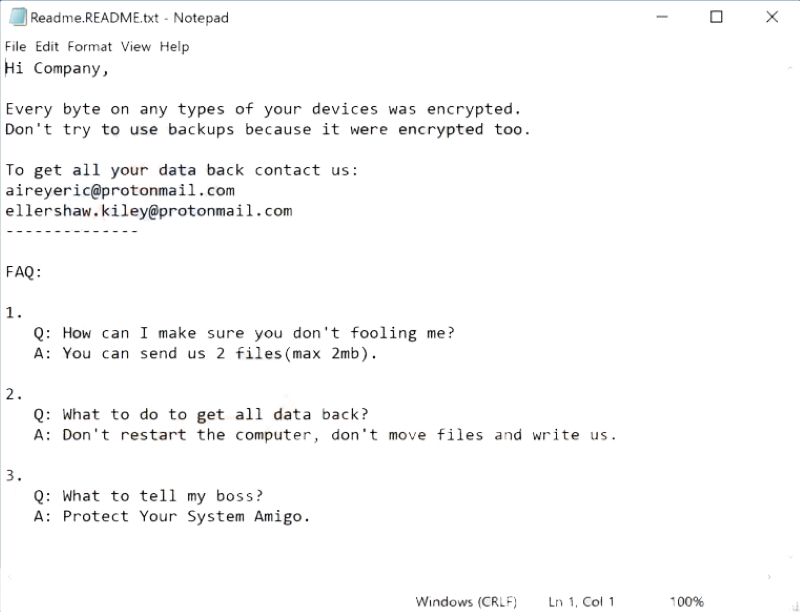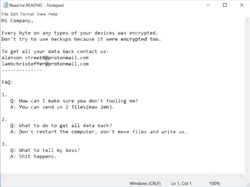 Mespinoza continues incrementally cementing its name around ransomware developers and produced another variation called Pysa. This version acts like others – it strikes files stored on your system by locking them down with .pysa, .locked or .newversion extensions. For instance, 1.mp4 will be renamed to 1.mp4.pysa, 1.mp4.locked and so forth. After this, the program creates a note called Readme.README with the following information: