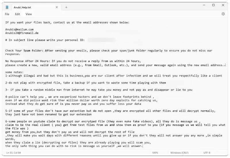 Decryption of .Anubi files remains a significant challenge due to the sophistication of the encryption techniques employed. As of now, no public decryption tools are available that can restore files without involvement from the attackers themselves, who often require payment for the decryption keys. While paying the ransom might seem the quickest solution, it is strongly advised against, as there is no guarantee that cybercriminals will honor their promises to decrypt the files. Victims are encouraged to rely on backups, if available, as the most secure route to data recovery. For those with no backups, using data recovery tools might offer some possibility of file recovery, though the success rate varies. Security experts continuously monitor emerging breakthroughs in decrypting ransomware, hoping for the eventual development of a public decryption solution. In the interim, protecting against ransomware through robust security practices and regular data backups remains the best defense.