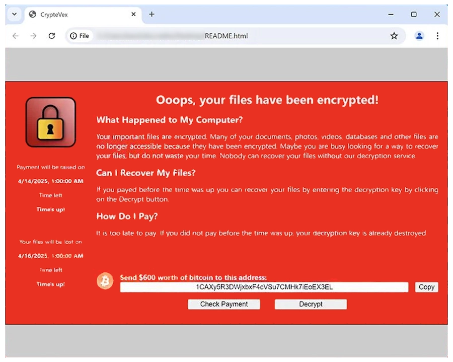 CrypteVex Ransomware is a malicious software program classified as ransomware, primarily designed to encrypt valuable data on a targeted system and subsequently demand a ransom in exchange for a decryption key. Upon infiltrating a computer, it systematically encrypts files, rendering them inaccessible, and appends each file name with a .cryptevex extension, indicating their compromised state. For instance, a file named document.txt would become document.txt.cryptevex post-infection. Employing robust cryptographic algorithms, often a combination of symmetric and asymmetric encryption, CrypteVex ensures that without the decryption key, deciphering the locked files is virtually impossible for the average user. Victims are typically greeted with a ransom note, which is both pasted as the desktop wallpaper and saved as an HTML file named README.html in various directories. This message ominously warns users about their encrypted files, urging them to purchase a decryption tool from the attackers within a specified time frame, with threats of doubling the ransom if delayed beyond two days.