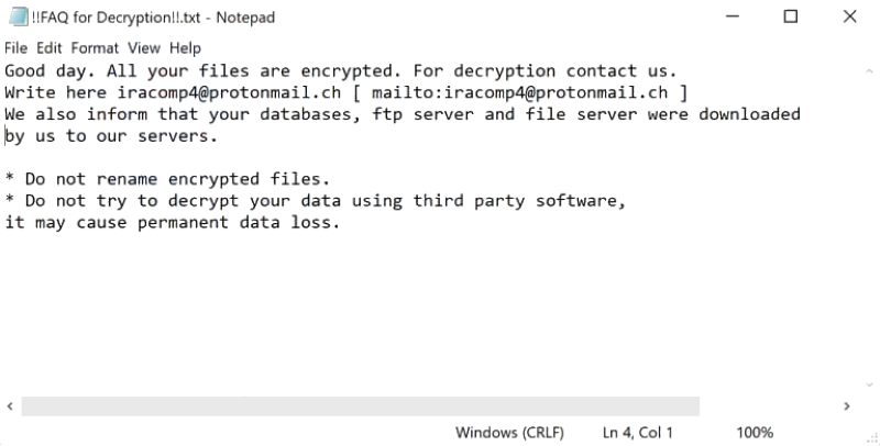 Write here iracomp4@protonmail.ch [ mailto:iracomp4@protonmail.ch ] We also inform that your databases, ftp server and file server were downloaded by us to our servers.