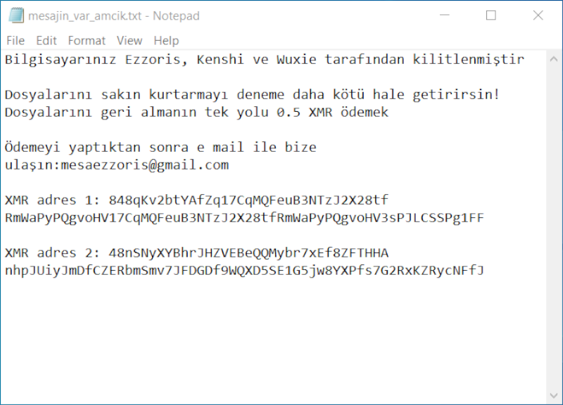 ). The ransomware changes the desktop wallpaper and creates a ransom note named mesajin_var_amcik.txt in Turkish, demanding a payment of 0.5 XMR (Monero cryptocurrency) for file decryption. The ransom note instructs the victim not to attempt file recovery independently, as it could worsen the situation. Once the payment is made, the victim is directed to send an email to mesaezzoris@gmail.com. Below is a sample of the ransom-demanding message.