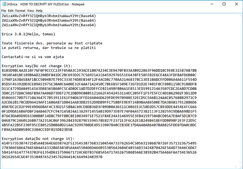 Erica Encoder is a ransomware infection that uses AES algorithms to encrypt user’s data. All files that experience a touch of the virus, change their names to a randomly-generated string of symbols. As an example, the original 1.mp4 will lose its initial name and appear as something like this R29vZ24lIENocm9tZS5s3ms9.qgazlb. Then, once all files get assigned with an encryption cipher, Erica Encoder creates a ransom note called HOW TO RESTORE ENCRYPTED FILES.TXT that is supposed to explain how to restore your data.
