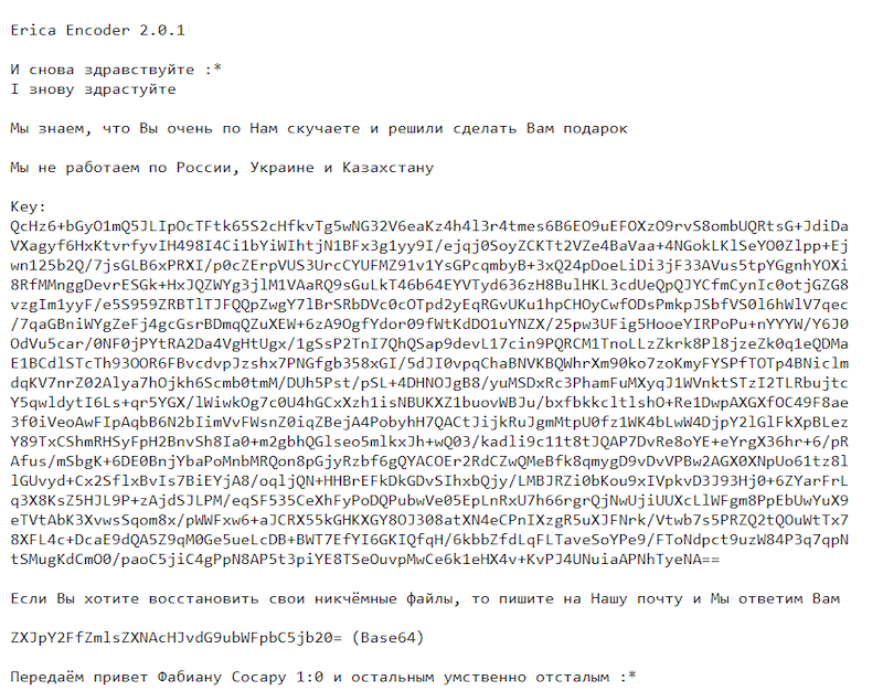 Unfortunately, there is no information given on that topic. No e-mails or links to pay the ransom are provided. This could mean that this version is still under development and has not been launched just yet. Moreover, the text is mostly written in Ukrainian and Russian, which indicates Erica Encoder is developed for the Russian-spoken community. At the end of the ransom message, extortionists might spell some jokes to mock at desperate victims. One of them is “Делай вовремя бэкапы, неудачник” which literally means “Do backups on a schedule, loser”. There is actually an element of truth in this statement because this is the only way to restore your data completely. If you have an external backup created prior to the infection, you should delete Erica Encoder first, and then plug external drives to copy original files back to your PC. Whatever the case, follow our guide to learn more about protection and decryption measures to restore the affected data.