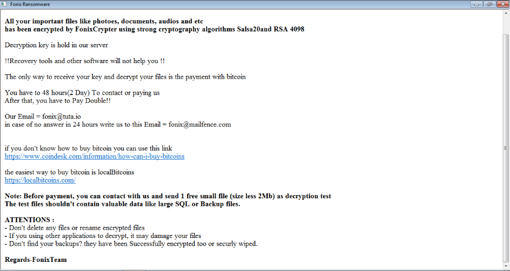 Don’t find your backups? they have been Successfully encrypted too or securly wiped.It is said that no third-parties tools will be able to decrypt your files because their key is stored on cybercriminal’s servers. Instead, developers propose you to buy their decryption key in Bitcoin. If you fail to do this within 2 days, your fee will be doubled immediately. Also, they offer detailed info on how to convert money to BTC in case you have never done it before. As a consolation bonus, extortionists provide decryption of 1 small file for free. Despite this, it is dangerous to pay for the key, because they tend to dumb gullible users, as statistics say. Unfortunately, it is true that there are no feasible methods to unlock files encrypted by Fonix Ransomware. The best way to restore it is by using an external backup of lost files, if possible. If not, we recommend you to delete Fonix Ransomware and start making scheduled backups of valuable data at least once a month.