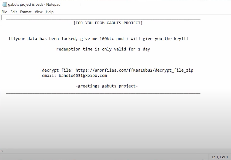 _____________________________________________The text is written in first person with requests to send 100 BTC for data decryption. This is exactly the price victims should send in order to restore the data. It is also mentioned this payment has to be done within 1 day after infection. To begin communication, victims should write to the pinned e-mail address. According to the text, there is also an option to decrypt 1 file by accessing the tor link. Unfortunately, nobody will pay the price of 100 Bitcoins (5,712,670$) unless it is a big corporation that lost extremely important data. Even if there is a more affordable price, it is still not recommended to pay it. Many cybercriminals tend to dump their victims and not send any promised tools back even after receiving the ransom. This is why the best way to recover your data risk-free is via backup copies. If you had them stored on external storage prior to the infection, then you can easily use them after deleting the virus. Third-party tools may contribute as well, but only if no backup copies are present. This is because no third-party tool has officially proved to be able to decrypt GABUTS PROJECT files with 100% guarantee. Nevertheless, we will leave information about the most effective and time-tested decryption tools that may help you approach successful decryption. Apart from recovering data, it is also important to delete the malicious infection that caused these problems. You will find instructions on “how” in our article below.
