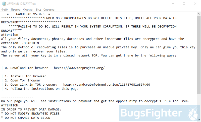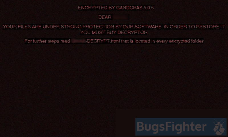 GandCrab V5.0.5 Ransomware is subversion of the fifth generation of high-risk GandCrab Ransomware. Probably, this virus was developed in Russia. This crypto-extortor encrypts user and server data using the Salsa20 algorithm, and RSA-2048 is used for auxiliary key encryption. 5-th version appends .[5-8-7-8-9-random-letters] extension to encrypted files and creates ransom note called [5-6-7-8-9-random-letters]-DECRYPT.txt. Examples of ransom notes: VSVDV-DECRYPT.html, FBKDDP-DECRYPT.html, IKJBAGX-DECRYPT.html, QPJBIKKA-DECRYPT.html. Here is the content of this html-file:
