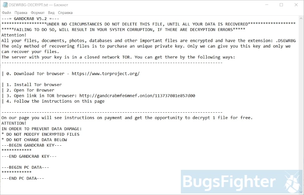 GandCrab v5.2 Ransomware was released just few hours before Europol, Romanian Police and Bitdefender released full-functional decryption tool for all previous versions of virus, up to GandCrab v5.1 Ransomware. Updated version of GandCrab adds .[5-6-7-8-9-10-random-letters] extension and ransom note file will get such name: [5-6-7-8-9-10-random-letters]-DECRYPT.txt and [random-letters]-DECRYPT.html. Here is the message from this file: