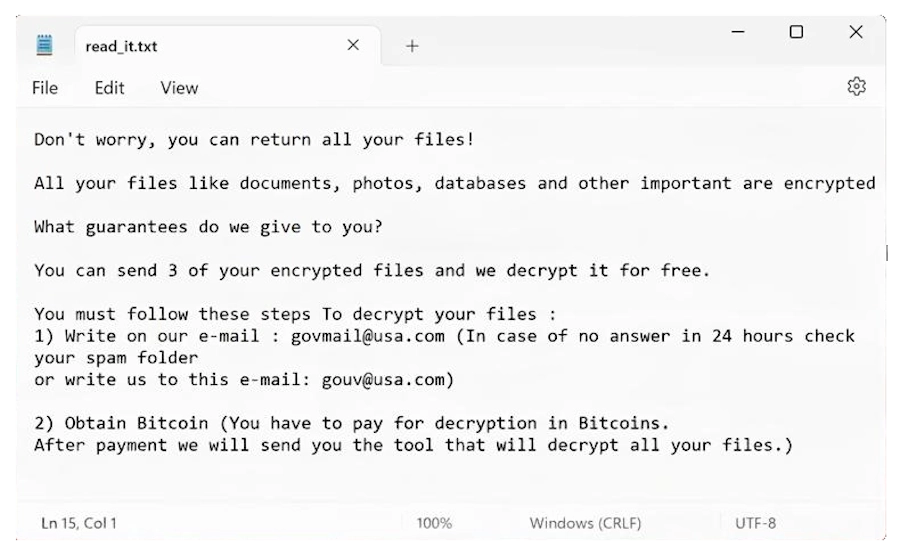Govcrypt Ransomware is an emerging crypto-malware threat that belongs to the Chaos ransomware family, following the typical methods of modern file-locking viruses. Upon successful infiltration, it systematically encrypts a wide array of file types on the victim’s machine and appends the distinctive .govcrypt extension to every compromised file, thereby rendering documents, images, and databases inaccessible. Users will quickly notice previously familiar files like photo.jpg altered into photo.jpg.govcrypt, indicating successful encryption. To pressurize victims into compliance, the malware also modifies the desktop wallpaper and places a ransom note called read_it.txt right onto the desktop. This message demands payment in Bitcoin and claims to offer free decryption for up to three files as proof, while providing cybercriminal contact details to facilitate negotiation. Govcrypt utilizes strong asymmetric or symmetric cryptographic algorithms typical of Chaos-based ransomware, ensuring that unauthorized decryption is virtually impossible without access to a unique key kept by the attackers. The ransom note is uncompromising—pay up, it says, or lose access to your files—and its location on your desktop makes its threat impossible to ignore.