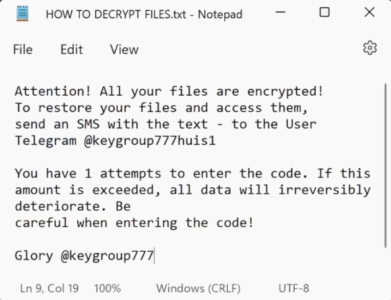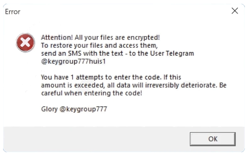 Key Group Ransomware is a malicious software identified while inspecting new submissions to VirusTotal and belongs to the Xorist ransomware family. After infiltrating a system, Key Group Ransomware encrypts victim files and appends specific extensions such as .keygroup, .keygroup777, or .keygroup777tg, depending on the variant. For instance, a file initially named document.docx would be renamed to document.docx.keygroup777 if compromised by this ransomware. The encryption algorithm used, typically found in Xorist ransomware, is a strong cryptographic method intended to prevent unauthorized access without a decryption key. Once the encryption is complete, the ransomware displays a pop-up window and leaves a text file named HOW TO DECRYPT FILES.txt on the infected system. Both the pop-up and the text file instruct victims to contact the attackers for file decryption, stating that incorrect entry of the decryption code could result in permanent data loss.