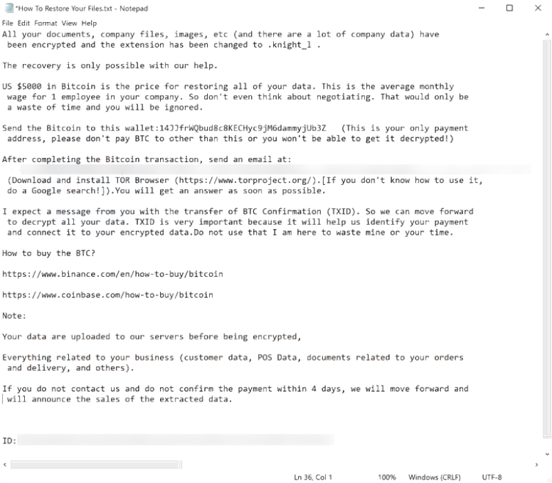 ID: -Unfortunately, there are no decryption tools available yet for Knight Ransomware. The group behind Knight operates it as Ransomware-as-a-Service, and these threat actors also offer information-stealing malware. Therefore, there is a possibility that these ransomware infections could have a double-extortion element to them. To decrypt files encrypted by Knight Ransomware, the only solution is to recover them from a backup (if one was created beforehand and is stored elsewhere). Paying the ransom is not recommended as it does not guarantee that the attacker will provide the decryption key.