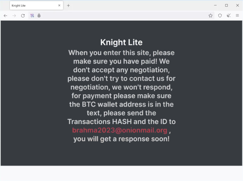 Knight Ransomware is a type of malware that encrypts all the data on a computer, including images, text files, audio files, videos, and more. Knight Ransomware is a rebrand of the Cyclops Ransomware-as-a-Service, which switched its name at the end of July 2023. Once the ransomware infects a computer, it appends the .knight_l extension to every encrypted file and leaves a ransom note named How To Restore Your Files.txt in each folder on the computer. The ransom note demands $5,000 to be sent to a Bitcoin address and contains a link to the Knight Tor site. However, every ransom note in this campaign utilizes the same Bitcoin address of 14JJfrWQbud8c8KECHyc9jM6dammyjUb3Z, which would make it impossible for the threat actor to determine which victim paid a ransom. Knight Ransomware uses AES-256 encryption algorithm to encrypt files. This encryption algorithm is considered to be one of the most secure encryption algorithms available. The ransomware also uses RSA public key (2048 bit) to encrypt the random key used for encryption.