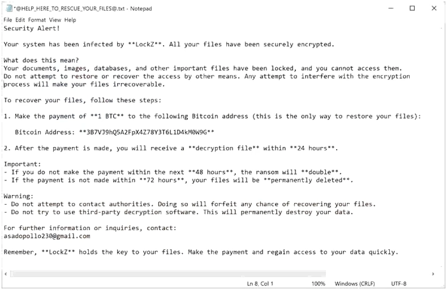LockZ Ransomware is a malicious software designed to encrypt files on a victim’s computer and demand payment for their release. Once it infiltrates a system, it appends the file extension .lockz to each encrypted file, rendering them inaccessible. For example, a file named document.docx would be renamed to document.docx.lockz. The ransomware employs complex encryption algorithms to ensure that victims cannot easily decrypt the affected files without the key. After the encryption process is complete, LockZ changes the desktop wallpaper and drops a ransom note titled @HELP_HERE_TO_RESCUE_YOUR_FILES@.txt. This note informs the victim of the attack and provides instructions on how to pay the ransom to recover their files, typically demanding 1 Bitcoin as payment and threatening to double the ransom if not paid within 48 hours.
