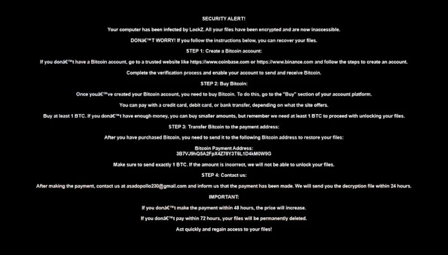 Remember, **LockZ** holds the key to your files. Make the payment and regain access to your data quickly.Currently, there are no universal decryption tools available for LockZ. The encryption used by this ransomware is sophisticated enough that decryption without the specific key is impossible, barring the discovery of flaws in the ransomware’s code. Victims are strongly advised against paying the ransom, as there is no guarantee that the attackers will provide the decryption key after payment. Instead, victims should focus on removing the ransomware from their systems to prevent further encryption. While third-party data recovery tools or services might sometimes help in partially recovering specific file types, they are not reliable solutions for decrypting .lockz files. Prevention through regular data backups and robust security measures remains the most effective strategy against ransomware like LockZ.