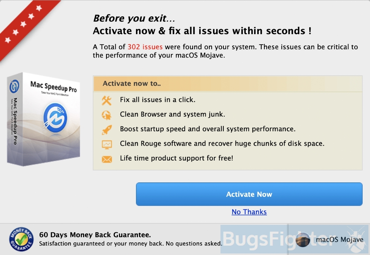 Mac Speedup Pro is rogue optimisation application for macOS. It hiddenly installs on a computer and performs so-called “scan” of your Mac. In the end, loud female voice vocalizes, that severe issues and viruses were found on your Mac. If users click the “Repair” button, the program shows the purchase window. In fact, Mac Speedup Pro “detects” performance and security problems even on brand new Mac computer. From what we can make a conclusion, that it is a scareware or fake optimization app. Actually, Mac Speedup Pro is one of the wide range of rogue apps like Mac Cleanup Pro, Mac Clean Pro, Advanced Mac Cleaner and others, that utilize similar design and techniques to extort money from inexperienced users. In this article, we will show a precise way to remove Mac Speedup Pro and its leftovers from Mac for free.