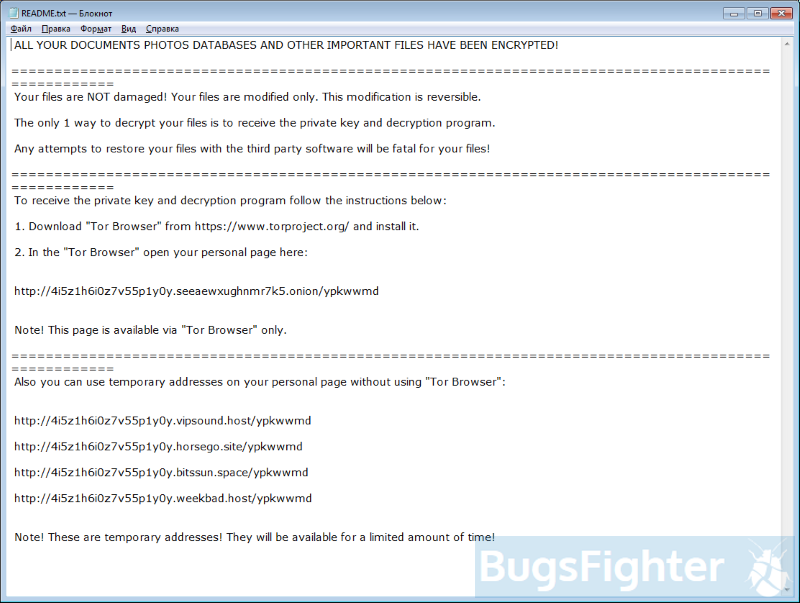 During the years ransomware used various names for ransom note files: _HOW_TO_DECRYPT_MY_FILES_[random]_.txt, READ_ME_FOR_DECRYPT_[random]_.txt, READ_ME_FOR_DECRYPT.txt. But the most actual is READ_ME.txt. File contains following message: