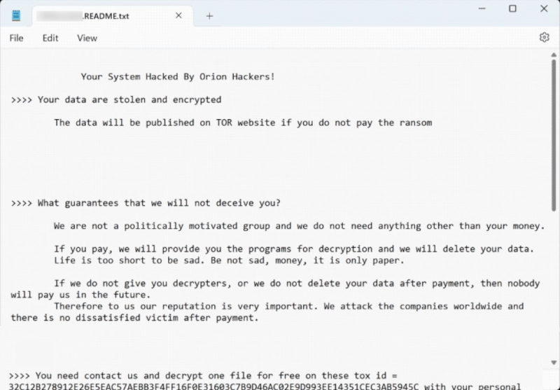 Warning! If you do not pay the ransom we will attack your company repeatedly again!Victims are instructed in the ransom note to contact the cybercriminals via a specific communication platform, and they are typically offered the opportunity to decrypt one file for free as proof of decryption capabilities. However, paying the ransom does not guarantee file recovery, as there have been instances where criminals failed to deliver the promised decryption tools post-payment. Currently, there are no known decryption tools available from security researchers that can unlock files encrypted by Orion Hackers without the original key from the attackers. Thus, the recommended course of action for victims is to rely on any previously made backups rather than attempting to meet ransom demands. If no backups are available, seeking assistance from cybersecurity professionals who may offer alternative recovery solutions, though limited, could be beneficial. Nevertheless, the importance of maintaining regular backups and employing robust cybersecurity practices cannot be overstated to mitigate the impact of threats such as Orion Hackers Ransomware.