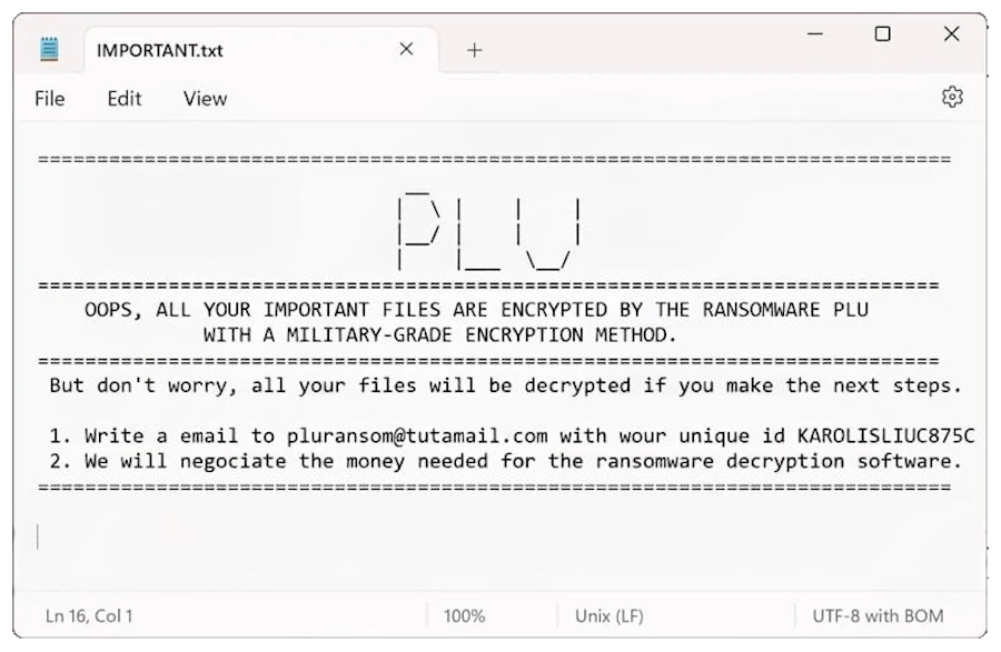 PLU Ransomware is a malicious software recently identified in the cybersecurity landscape, designed specifically to encrypt critical user files and demand ransom for their decryption. Operating under the guise of a sophisticated threat, it appends the .PLU extension to the affected files, transforming ordinary file names into a series of unintelligible characters, such as 1.jpg becoming 1e6e6c21-04b5-4487-b233-f201db8507be.PLU. This ransomware leverages “military-grade” encryption methods, making it virtually impossible to access the files without the unique decryption key held by the threat actors. Once the attack is complete, it delivers a ransom note titled IMPORTANT.txt, providing victims with detailed instructions on how to contact the attackers via email at pluransom@tutamail.com for negotiations over the decryption fee. The note also changes the desktop wallpaper, creating a constant visual reminder of the hostage state of one’s files.