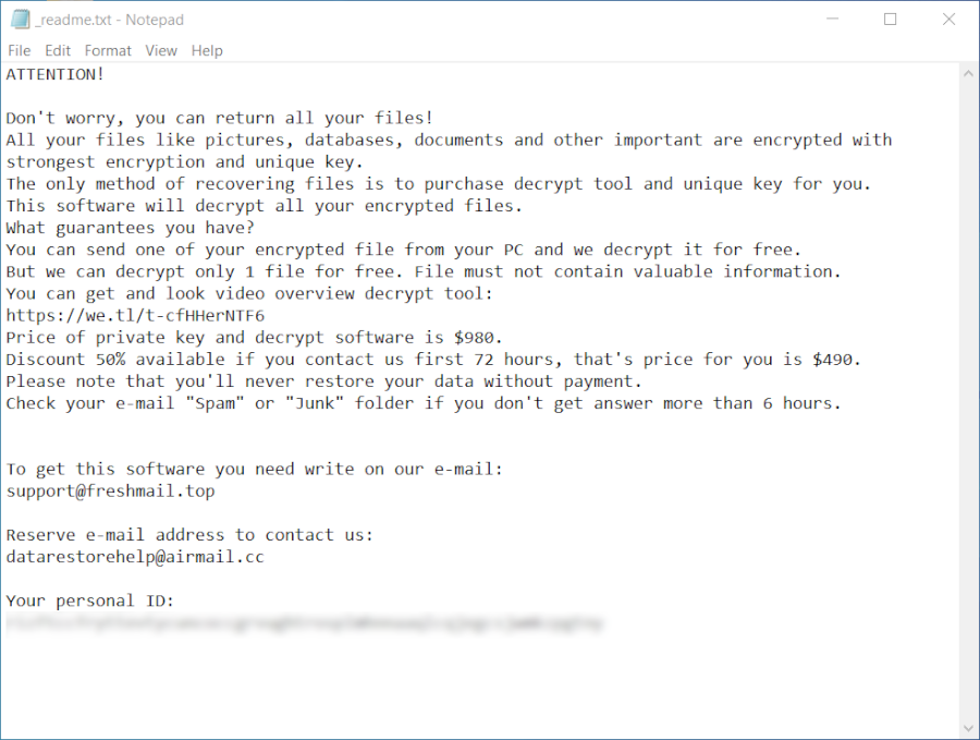 Ppvw Ransomware is a file-encrypting malware infection that restricts access to data such as documents, images, and videos by encrypting files with the .ppvw extension. It is a variant of the notorious STOP/DJVU ransomware family. The ransomware attempts to extort money from victims by asking for a “ransom”, typically in the form of Bitcoin cryptocurrency, in exchange for access to data. When Ppvw Ransomware infects a computer, it scans for images, videos, and important productivity documents and files such as .doc, .docx, .xls, .pdf. When these files are detected, the ransomware encrypts them. Once the Ppvw Ransomware has encrypted the files on a computer, it displays a ransom note named _readme.txt on the desktop. The note contains instructions on how to contact the authors of the ransomware, typically via email addresses such as support@freshmail.top