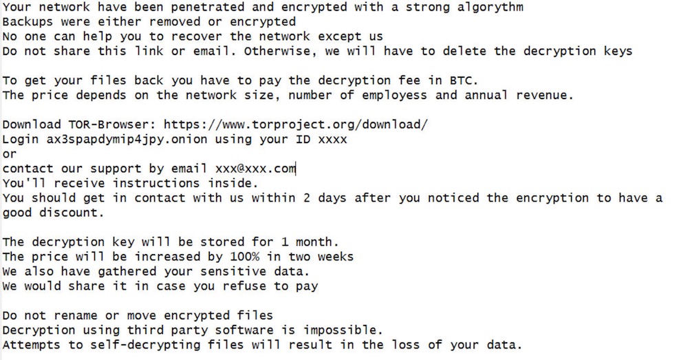 Attempts to self-decrypting files will result in the loss of your data.To restore the locked files, extortionists ask companies to buy a decryption key in BTC via Tor Browser or contact them through the attached e-mail to get further instructions. Also, unless you contact them within 2 weeks, the price will be increased by 100%. Unfortunately, it is true that decryption with third-parties tools is impossible because cybercriminals use RSA-2048 algorithms for ciphering the data. Instead, you can only remove PwndLocker Ransomware from your computer and retrieve the lost data from an external backup.