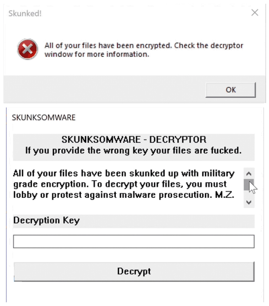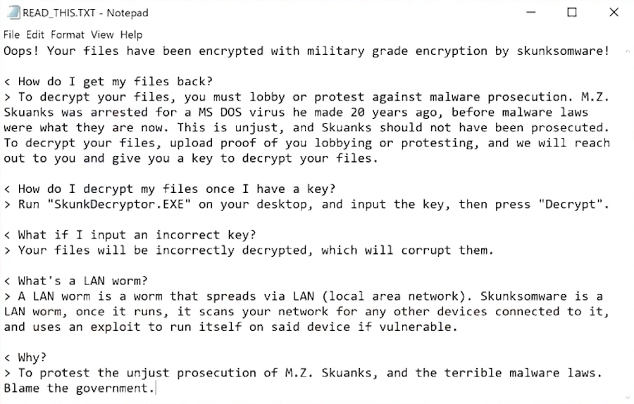 < Why? > To protest the unjust prosecution of M.Z. Skuanks, and the terrible malware laws. Blame the government.Regarding tools for decrypting files affected by SKUNK Ransomware, there are currently no publicly available decryption tools. This implies that decrypting the .SKUNK files without the perpetrator’s private key or intervention is virtually impossible. Victims are advised against complying with ransom demands or suggested actions due to the high risk of scams and potential additional threats such as further malware distribution on their networks. Instead, emphasis is placed on the importance of regular data backups as a preventative measure against such incidents, allowing users to restore their data without having to decrypt the affected files directly. For those already impacted, employing data recovery tools like Recuva may offer some hope of file restoration by retrieving copies of data stored prior to encryption. However, these tools are not guaranteed to recover all lost data, and their success relies heavily on the extent of encryption and the integrity of previously saved system data.