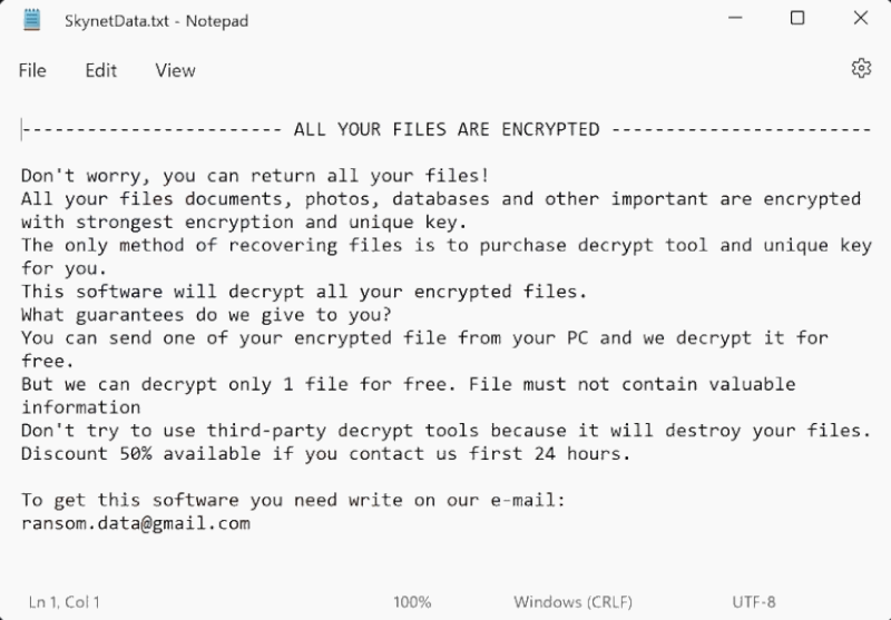 Skynet Ransomware spreads through various methods, including spam emails containing infected attachments or links, social media, file-sharing services, and pirated software. Once the malware is on the victim’s computer, it starts to encrypt all data files it can find on the machine itself and on any network shares the PC has access to.