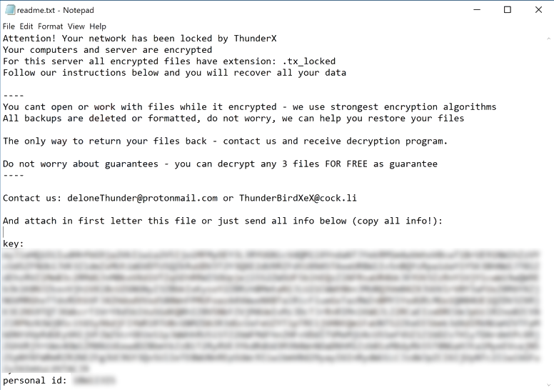 Also known as Ranzy Locker, ThunderX 2.1 is a new ransomware sample that runs thorough data encryption. Depending on which version attacked your system specifically, you may see one of these 3 different extensions assigned to data – .RANZY, .RNZ, .tx_locked, or .lock. To illustrate, an innocent file like 1.pdf will change to 1.pdf.RANZY, 1.pdf.tx_locked, or 1.pdf.lock at the end of encryption. It will also reset its shortcut to blank. Right after this, the virus creates a text note named readme.txt that contains ransom instructions.