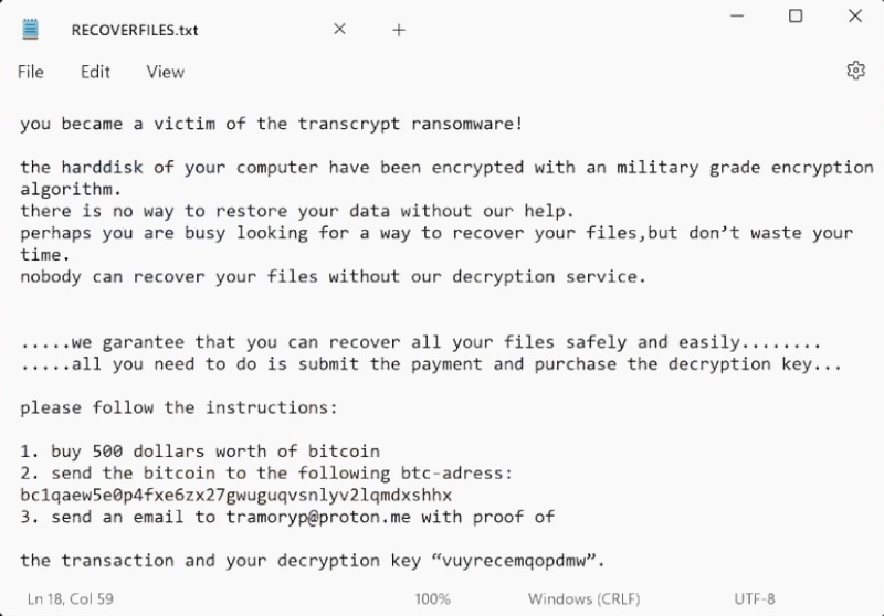 the transaction and your decryption key “vuyrecemqopdmw”.As of the current knowledge, there are no specific decryption tools available for TransCrypt Ransomware that can guarantee the recovery of encrypted files. Victims are generally advised against paying the ransom, as there is no assurance that the attackers will provide the decryption key upon payment. Moreover, paying the ransom fuels the cybercriminal economy, encouraging further attacks. Recovering files encrypted by TransCrypt Ransomware involves a few potential strategies, albeit with no guarantee of success. Victims are encouraged to restore their files from backups if available. It’s crucial to ensure that backups are stored in a location not connected to the infected systems to prevent them from being encrypted as well. Utilizing file recovery tools may also help recover some files, depending on the situation. Additionally, victims should keep an eye on cybersecurity communities for any future developments regarding decryption tools for TransCrypt Ransomware.