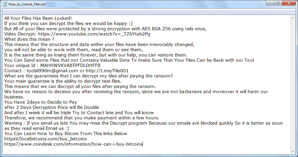 Vash-Sorena is a ransomware virus that encrypts files and demands to pay a fee to decrypt it. Some rumors say that it is another version developed by Dharma(CrySiS) or Banks1 family. Likewise, Vash-Sorena encrypts files according to this pattern -.[].crypto or -.[].zip which has not been that popular around extortionists. Here is an example of compromised files reported by one of the victims – eula.1041.txt.Id-JGPXXOBN.[yourfile2020@protonmail.com].crypto or .Email=[russiawolf09@gmail.com]ID=[JGPXXOBN].zip. ID numbers with random hexadecimal characters are used presumably to highlight the relevance and identify victims. After successful encryption, the virus creates a text file called How_To_Decrypt_Files.txt.