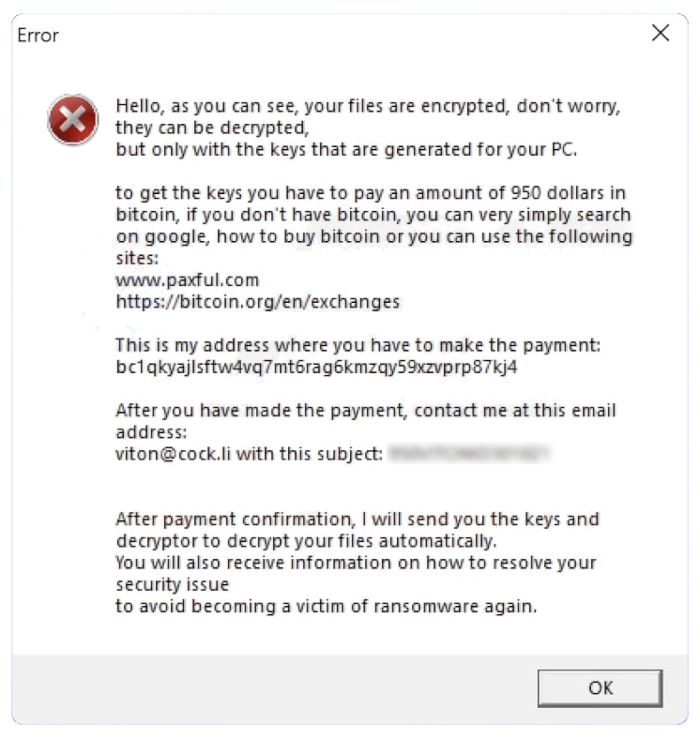 ViT Ransomware is a malicious program identified as part of the Xorist ransomware family. It primarily targets user files, encrypting them to demand a ransom payment for their release. Upon infection, ViT appends the encrypted files with a distinctive file extension, .ViT, making them inaccessible. For example, a file originally named photo.jpg would be renamed to photo.jpg.ViT, rendering it useless without a decryption key. The ransomware uses a combination of symmetric and potentially asymmetric encryption algorithms to ensure that the data is securely locked, thus complicating the decryption process without the appropriate key held by the cybercriminals. Once the files are encrypted, ViT generates a ransom note, typically named HOW TO DECRYPT FILES.txt, which is deposited in each folder containing encrypted files. Additionally, a pop-up window is displayed to the victim, reinforcing the ransom demand and instructing them to make a payment, usually in Bitcoin, to a specified wallet.