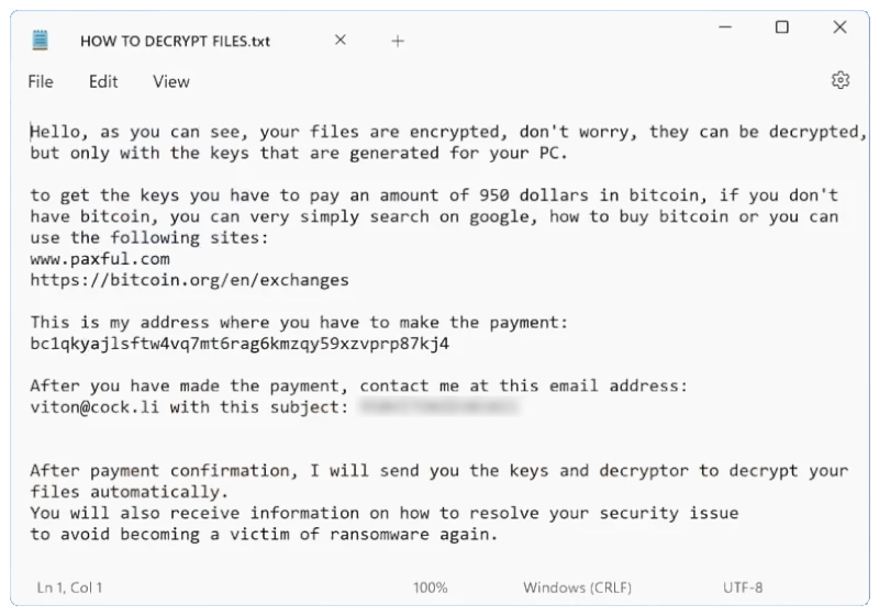to avoid becoming a victim of ransomware again.Despite the aggressive tactics of ViT, there are, as of now, no publicly available decryption tools that can reliably decrypt files encrypted by this ransomware without the key. The ransom note usually urges victims to contact the attackers via email for further instructions after payment, but paying the ransom is strongly discouraged by cybersecurity experts, as it often leads only to financial loss without any guarantee of data recovery. Instead, users affected by ViT should report the incident to local authorities and focus on identifying the ransomware to explore any possible decryption tools, as new developments in cybersecurity may occasionally lead to the discovery of vulnerabilities in ransomware code. Users are advised to use trusted platforms like the No More Ransom project to check for decryption solutions, although success in decrypting .ViT files remains unlikely. In the absence of decryption capabilities, victims must rely on restoring their files from backups, if available, reassets the infected system, and employ robust cybersecurity measures to prevent future ransomware attacks.