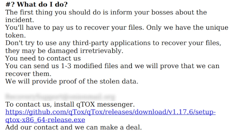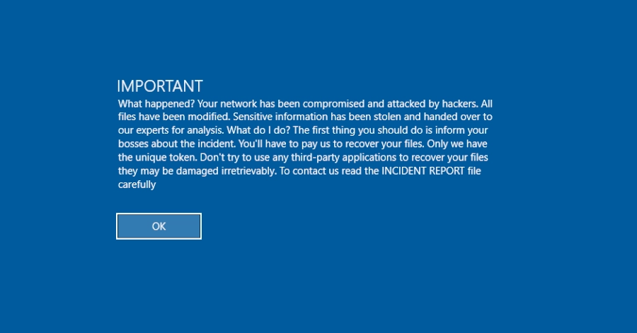 What happened? Your network has been compromised and attacked by hackers. All files have been modified. Sensitive information has been stolen and handed over to our experts for analysis. What do I do? The first thing you should do is inform your bosses about the incident. You'll have to pay us to recover your files. Only we have the unique token. Don't try to use any third-party applications to recover your files they may be damaged irretrievably. To contact us read the INCIDENT REPORT file carefully#? What happened?