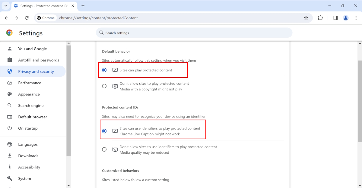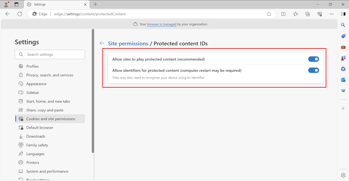 - Turn on Allow sites to play protected content. Optionally, enable Allow identifiers for protected content for personalized content.