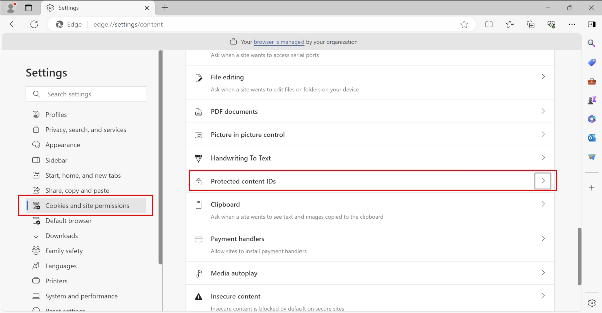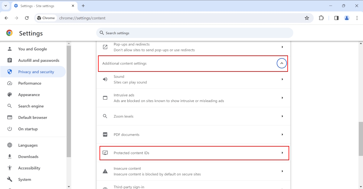 - Navigate to Settings > Privacy and security > Site Settings > Additional content settings > Protected content IDs.
