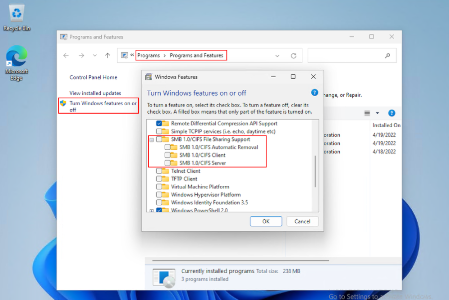 Sometimes, enabling SMB 1.0/CIFS file sharing support can resolve the network path not found error. Here’s how you can enable it: