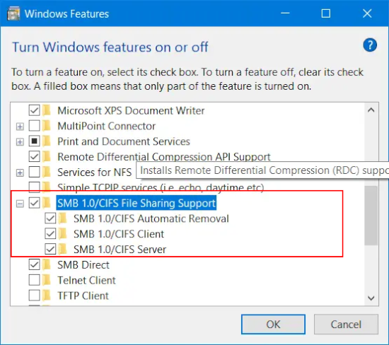 - Scroll down and locate SMB 1.0/CIFS File Sharing Support. Check the box to enable it and click OK.
