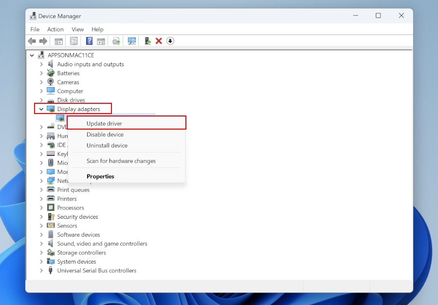 - Expand the Display adapters section, right-click on your graphics card, and choose Update driver.