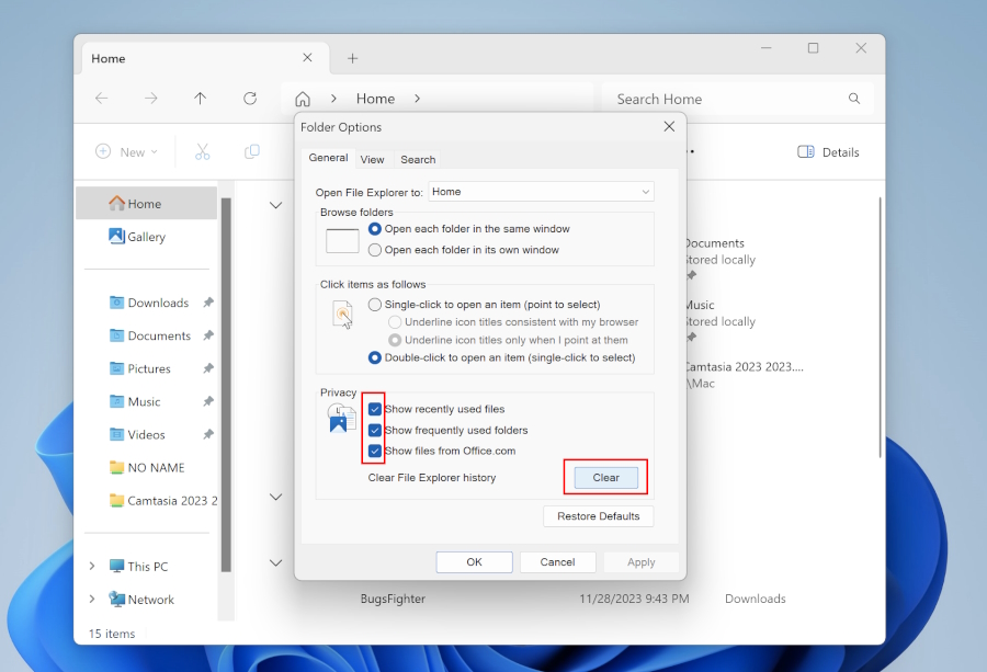 - Under the Privacy section, make sure to check all checkboxes, and click on Clear next to Clear File Explorer history.
