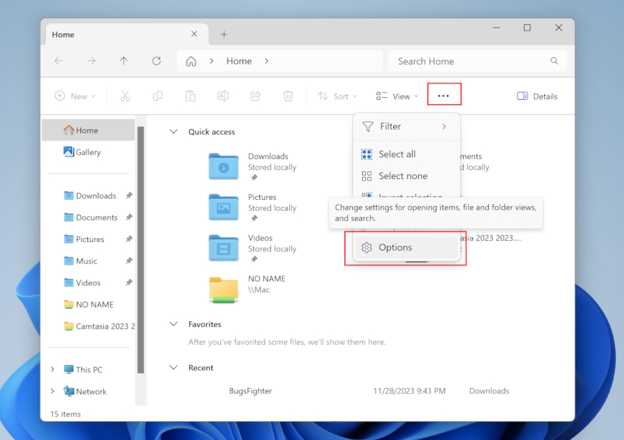 - Click on the three dots (…) or More options in the toolbar and select Options.