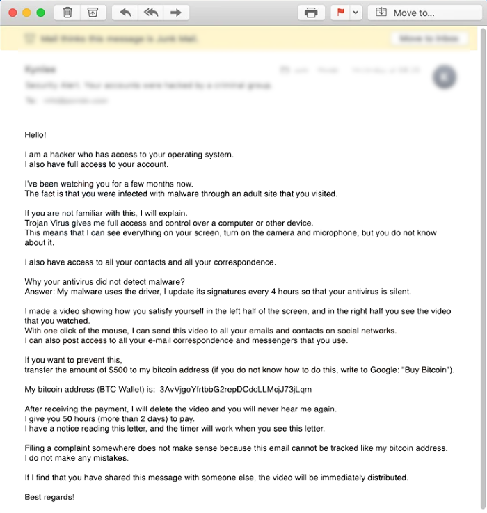 The Hacker Who Has Access To Your Operating System email scam is a type of deceptive communication that can be classified as “sextortion”. Cybercriminals send out a large volume of these emails, claiming that they have gained control over the recipient’s computer and recorded a compromising video. However, it is crucial to recognize that this is nothing more than a scam, and these emails should be disregarded. In this email scam, the message alleges that the recipient’s computer has been infected with a trojan while supposedly visiting an adult website. The criminals further claim that they have utilized the computer’s webcam and microphone to record a video of the recipient engaged in explicit activities, as well as stolen their contact information. Following these assertions, the scammers issue a threat and demand a ransom. They threaten to send the recorded video, along with an alleged video that the recipient had watched, to all of their contacts unless a payment of $500 is made. The recipients are given a deadline of 50 hours to pay the ransom, and they are instructed to use Bitcoin cryptocurrency for the transaction.
