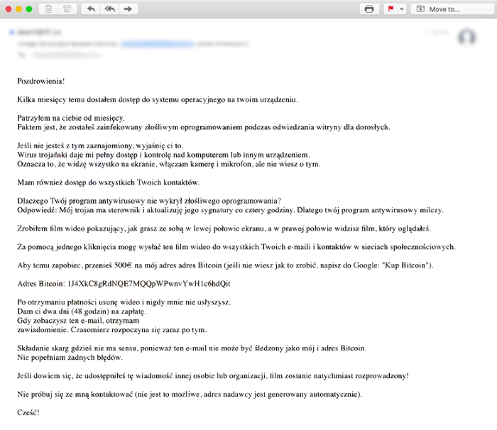 Aby temu zapobiec, przenieś 500€ na mój adres adres Bitcoin (jeśli nie wiesz jak to zrobić, napisz do Google: "Kup Bitcoin").