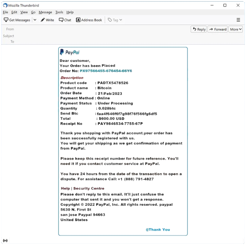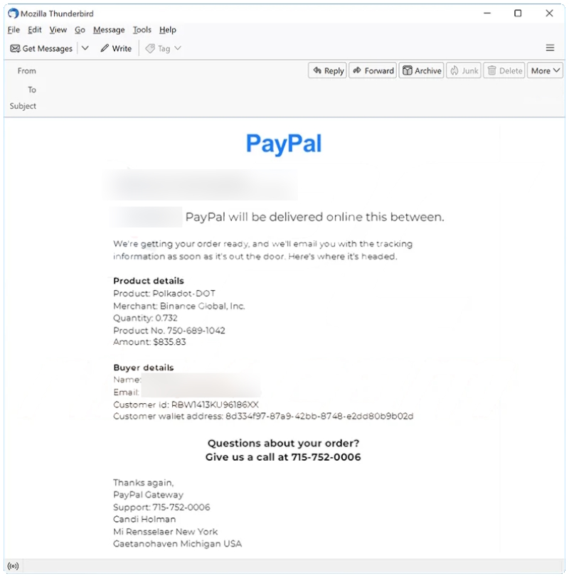 PayPal – Order Has Been Completed email scam is a sophisticated phishing attack designed to deceive recipients into believing that a transaction has been made through their PayPal account. Typically, these emails are crafted to look like official PayPal communications, complete with logos and formatting that mimic genuine PayPal notifications. The scam email informs the recipient about a purchase, often involving a significant amount of money or valuable items like cryptocurrency, and urges them to act if they did not authorize the transaction. The email usually contains a link or provides a phone number that the recipients are urged to use to resolve the supposed issue. If the recipient follows the link, they are directed to a phishing website that closely resembles the official PayPal site. Here, they are asked to enter their login credentials, and sometimes additional personal and financial information. Alternatively, calling the provided number can lead to direct interaction with scammers, who may use social engineering techniques to extract sensitive information or convince the victim to engage in risky financial actions.
