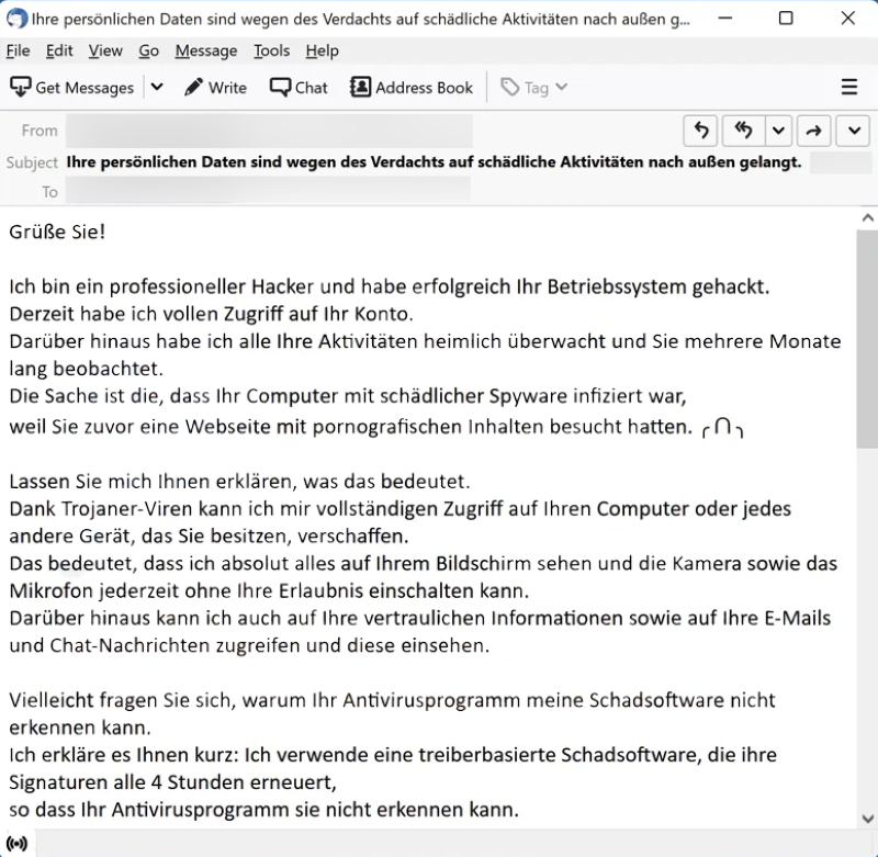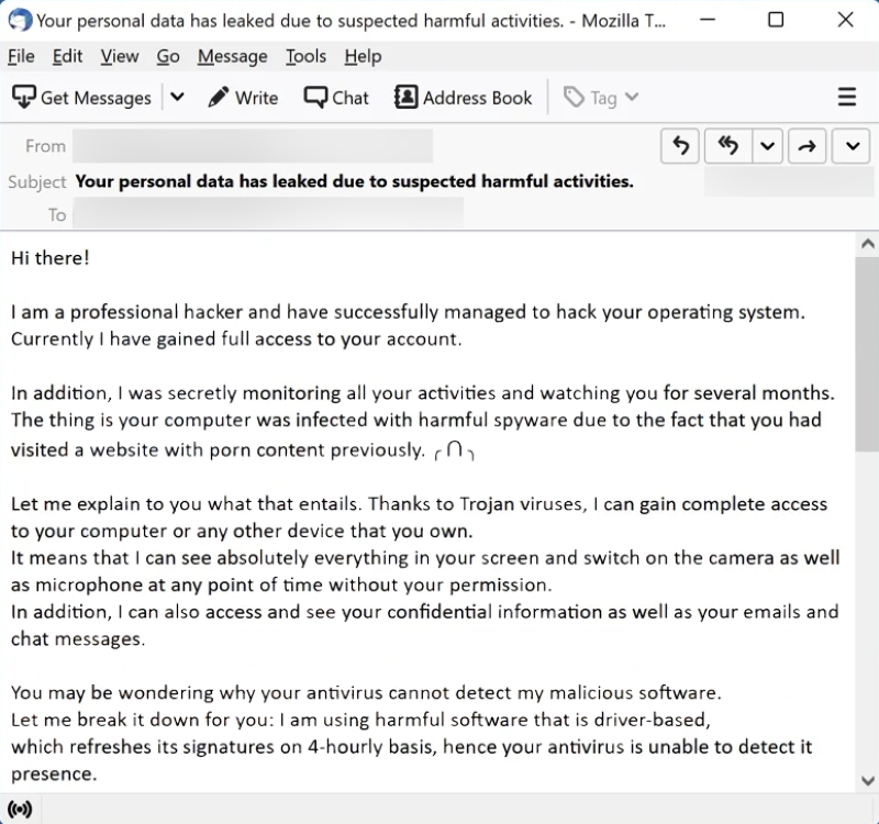 “Professional Hacker Managed To Hack Your Operating System” is a popular spam message designed to bait inexperienced users into thinking their computer has been hacked and therefore used for extracting explicit/private content from it. In fact, all the claims made by this or similar spam messages are fake and have nothing to do with what they say. The message usually claims that cybercriminals gained access to various recording devices (e.g., camera, microphone, screen) and have used them for recording sensitive content without users’ permission over the course of several months. It is said that threat actors managed to infiltrate a spyware virus which allowed them to get explicit recordings of e-mail recipients watching adult content on pornography websites. To keep the non-existent recordings unpublicized, scammers give 50 hours to pay 850 USD or 1750 EUR in Bitcoin cryptocurrency – or otherwise, the content will be leaked and shared with users’ contacts. As we already mentioned, the “Professional Hacker Managed To Hack Your Operating System” and other similar spam campaigns are designed to spread fake information and make users believe in non-existent threats. Thus, paying scammers is pointless and will simply end up being a waste of your money. Even if sometimes such messages partially coincide with what a person was doing, there is still nothing to worry about due to the aforementioned. Spam messages are countless and can be titled in different ways, such as “Your personal data has leaked due to suspected harmful activities.”, “Ihre persönlichen Daten sind wegen des Verdachts auf schädliche Aktivitäten nach außen gelangt.” and so forth. Beware of such messages and read our guide with useful tips on how to avoid such e-mail scam techniques and lower the chance of their delivery.