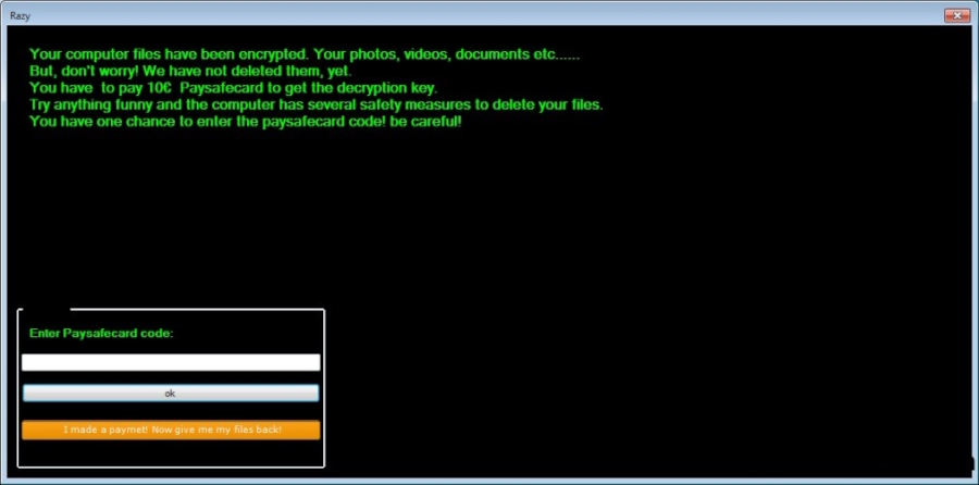 Your computer files have been encrypted. Your photos, videos, documents, etc... But, don't worry! We have not deleted them yet. You have to pay 10€ Paysafecard to get the decryption key. Try anything funny and the computer has several safety measures to delete your files. You have one chance to enter the paysafecard code! be careful!Razy employs asymmetric cryptography, which involves two keys: a public key for encryption and a private key for decryption. The decryption of files without the private key is impossible, and these keys are typically stored on remote servers controlled by the cybercriminals. However, research indicates that the keys generated by Razy are not stored anywhere, rendering decryption unfeasible. Consequently, there are currently no tools available that can decrypt files encrypted by Razy using asymmetric cryptography. The only viable solution for affected users is to restore their files or system from a backup. The emergence of Razy Ransomware underscores the continuous evolution of ransomware threats and the importance of maintaining regular backups of important data. Given its unique characteristics and the impossibility of decryption, Razy serves as a reminder of the sophisticated tactics employed by cybercriminals and the need for vigilance in cybersecurity practices.