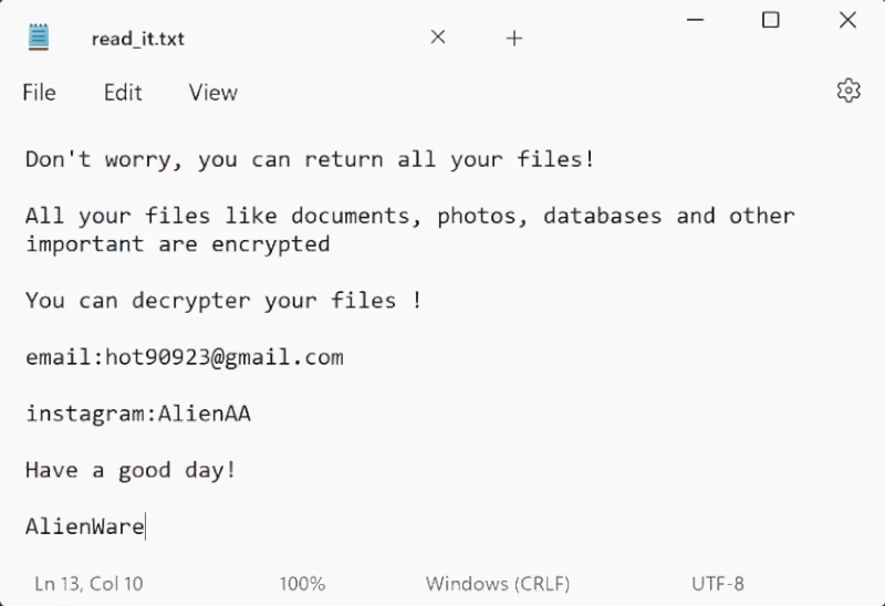 In the realm of evolving cyber threats, AlienWare Ransomware emerges as a particularly insidious form of malware. This ransomware variant is based on the Chaos framework, and upon infiltrating a computer system, it encrypts various file types, rendering them inaccessible. It appends a unique set of four random characters as new file extensions, effectively altering and isolating each file from user access. For instance, a document such as report.docx might be transformed into report.docx.a1b2 after encryption, leaving its contents inaccessible without the appropriate decryption key. AlienWare’s attack does not stop at mere encryption; it also alters the user’s desktop wallpaper as a stark notification of the attack, increasing the psychological pressure on the victim. After encryption, the ransomware delivers a ransom note, read_it.txt, onto the desktop, further directing victims on how to pay the ransom for file decryption.