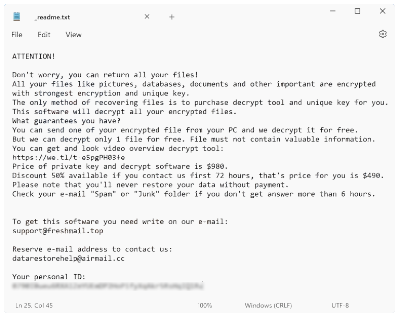 Azqt Ransomware is a malicious software that belongs to the Djvu malware family and is a variant of the notorious STOP/Djvu ransomware. It is designed to encrypt files on the victim’s computer and demand payment, usually in cryptocurrency, for their decryption. The primary purpose of Azqt Ransomware is to target the victim’s wallet by encrypting files and then asking for a ransom to decrypt them. Upon infiltrating a computer, Azqt ransomware encrypts files using a robust and unique encryption method, such as the Salsa20 encryption. It adds the .azqt extension to the filenames of the encrypted files, for example, changing 1.jpg to 1.jpg.azqt and 2.png to 2.png.azqt. Azqt ransomware generates a ransom note in the form of a text document named _readme.txt. The note explains that all files, including images, databases, documents, and essential data, have been encrypted and directs victims to purchase a decryption tool and a key to regain access to their files. The ransom amount ranges from $490 to $980 in Bitcoins.