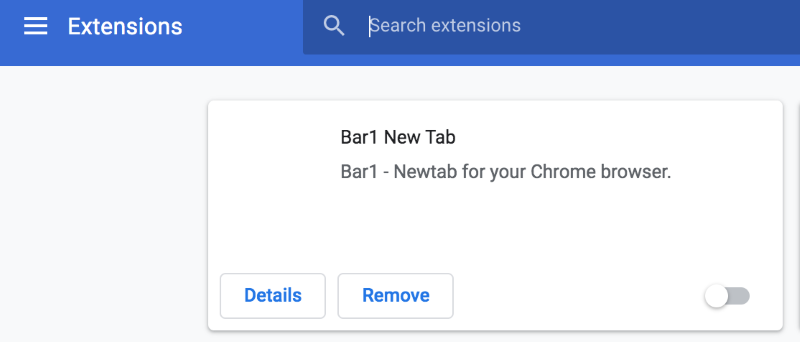 chrome://extensions. - Find Bar1 New Tab extension.