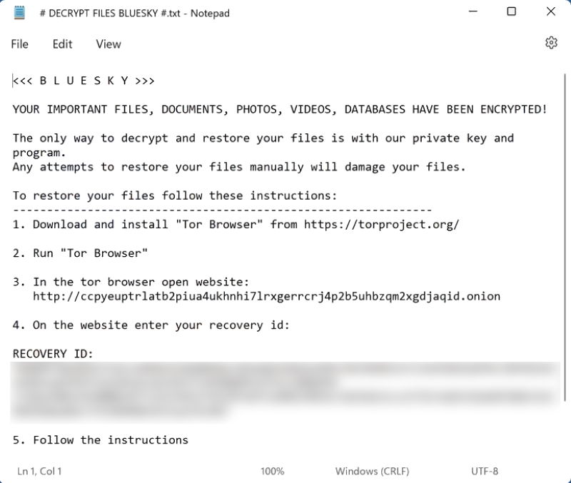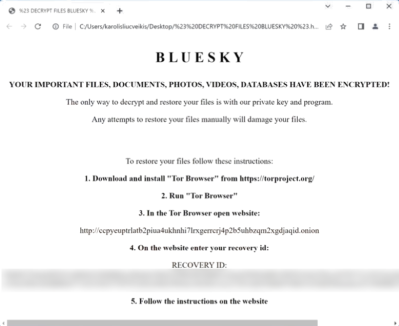 and reset its original icon. Since then, files will be no longer accessible. To make victims pay the ransom, cybercriminals layout identical decryption instructions in both # DECRYPT FILES BLUESKY #.html and # DECRYPT FILES BLUESKY #.txt text notes, which are created after encryption.