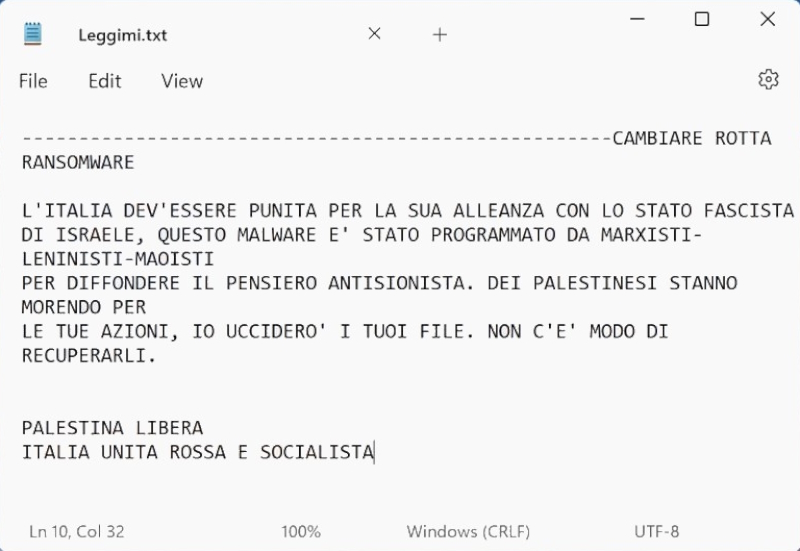 CAMBIARE ROTTA Ransomware is a type of cryptographic malware designed to encrypt files on a victim’s computer, rendering them inaccessible until a ransom is paid. Unlike typical ransomware, CAMBIARE ROTTA is geopolitically motivated, specifically targeting Italian users as a form of punishment for Italy’s geopolitical stance, particularly its alliance with Israel. This ransomware is part of the Chaos Ransomware family and is notable for its ideological rather than financial motivations. Once CAMBIARE ROTTA Ransomware infects a computer, it encrypts files using strong encryption algorithms such as AES (Advanced Encryption Standard) for file encryption and RSA (Rivest-Shamir-Adleman) for encrypting the AES key. The ransomware appends a random four-character extension to the filenames of encrypted files. For example, a file named document.pdf might be renamed to document.pdf.kg4v. After encrypting the files, CAMBIARE ROTTA Ransomware changes the desktop wallpaper and generates a ransom note titled Leggimi.txt (Italian for “ReadMe.txt”). The note contains a political message rather than instructions for paying a ransom. It states that Italy must be punished for its alliance with Israel and informs victims that there is no option for data recovery. This indicates that the primary motive behind CAMBIARE ROTTA is political rather than financial.
