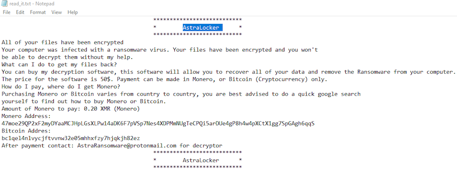 Chaos is a popular ransomware family that spreads a number of malware versions. Upon its infection, most files stored on a system get readjusted becoming no longer accessible. This is done by cybercriminals to extort the so-called ransom from victims in exchange for unblocking data. At the moment, there are 4 most popular versions propagated by Chaos – Axiom, Teddy, and AstraLocker Ransomware. All 4 assign their own extension whilst blocking access to data. For instance, a file like 1.pdf may change to 1.pdf.axiom, 1.pdf.teddy, 1.pdf.encrypted, or 1.pdf.astralocker depending on which version attacked your network. Initially, Chaos used to be called Ryuk.Net Ransomware, but then upgraded and started getting proliferated by the new name. What is more, Ryuk.Net only mimicked encryption with AES+RSA algorithms, but actually used Base64 coding to damage the structure of files. Not excluded the same can be faced in newer versions as well. It is also possible to see a version of Chaos appending a string of random characters to encrypted files – like 1.pdf.us00, 1.pdf.wf1d, and so forth. As soon as encryption (or fake encryption) gets to a close, the virus creates a text note with instructions on how to recover your data. Here are the names as well as the content of each text note created by different versions (README.txt, read_it.txt, READ_ME_NOW.txt):